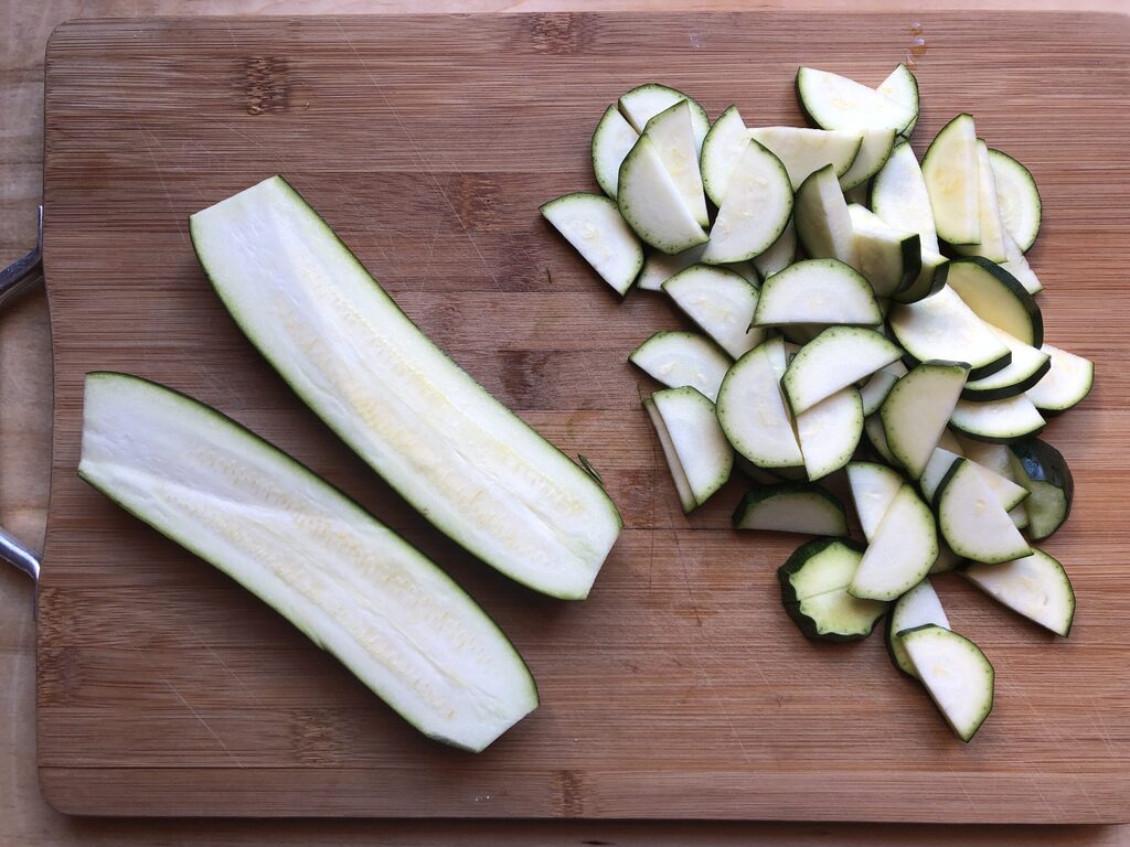 Équeuter les courgettes, les laver, les couper dans le sens de la longueur puis les trancher. Il suffit d’utiliser un couteau, je déconseille la mandoline car les tranches seraient trop fines.