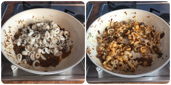 À ce stade, ajouter le hachis de câpres et d’olives et une bonne cuillère de concentré de tomate.