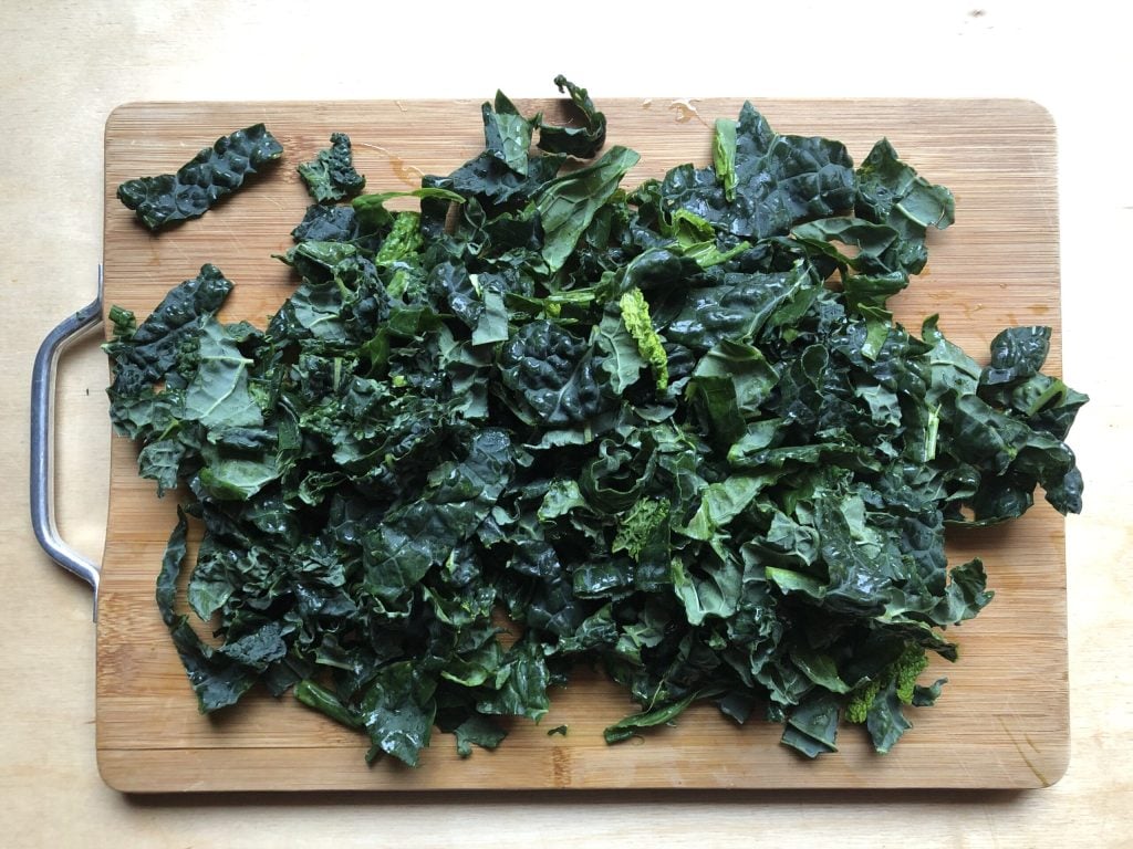 Nettoyez les feuilles de chou noir en enlevant la côte centrale dure, lavez-les bien sous l’eau courante et coupez-les en lanières. Saviez-vous qu’il existe une astuce pour enlever facilement la côte centrale du chou noir? Si vous ne la connaissez pas, cliquez ICI pour voir comment faire.