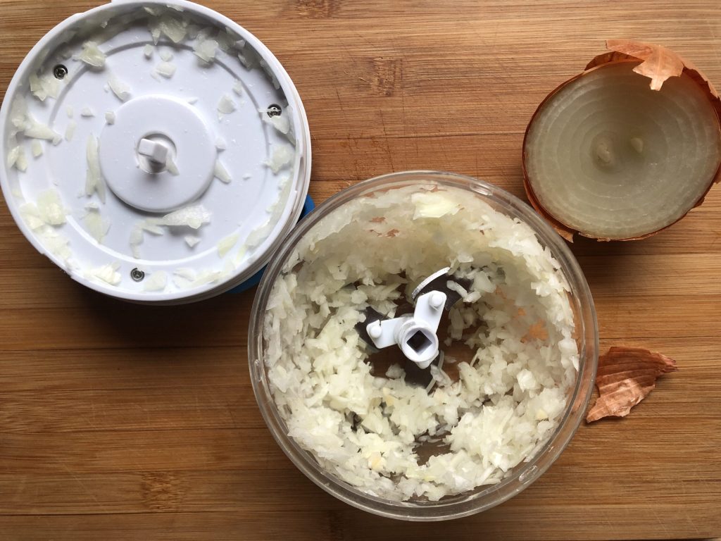Épluchez l’oignon et hachez-le finement. J’ai utilisé un hachoir manuel à corde que je trouve vraiment très pratique. Si vous souhaitez l’acheter, vous pouvez le trouver en cliquant ICI.