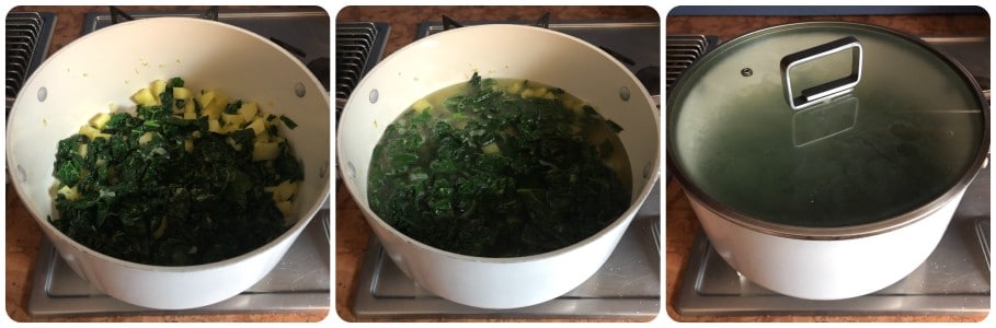 Laissez-le frémir un instant, puis ajoutez le chou noir, les pommes de terre et une pincée de sel.