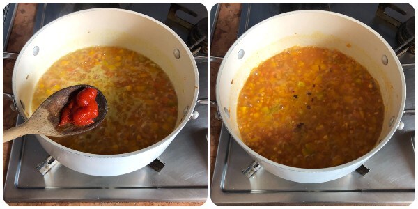 Bien mélanger, puis couvrir le tout avec du bouillon bouillant.Ajouter une cuillère à soupe de concentré de tomate et une pincée de piment (en vérité, vous pouvez le doser à votre goût personnel).