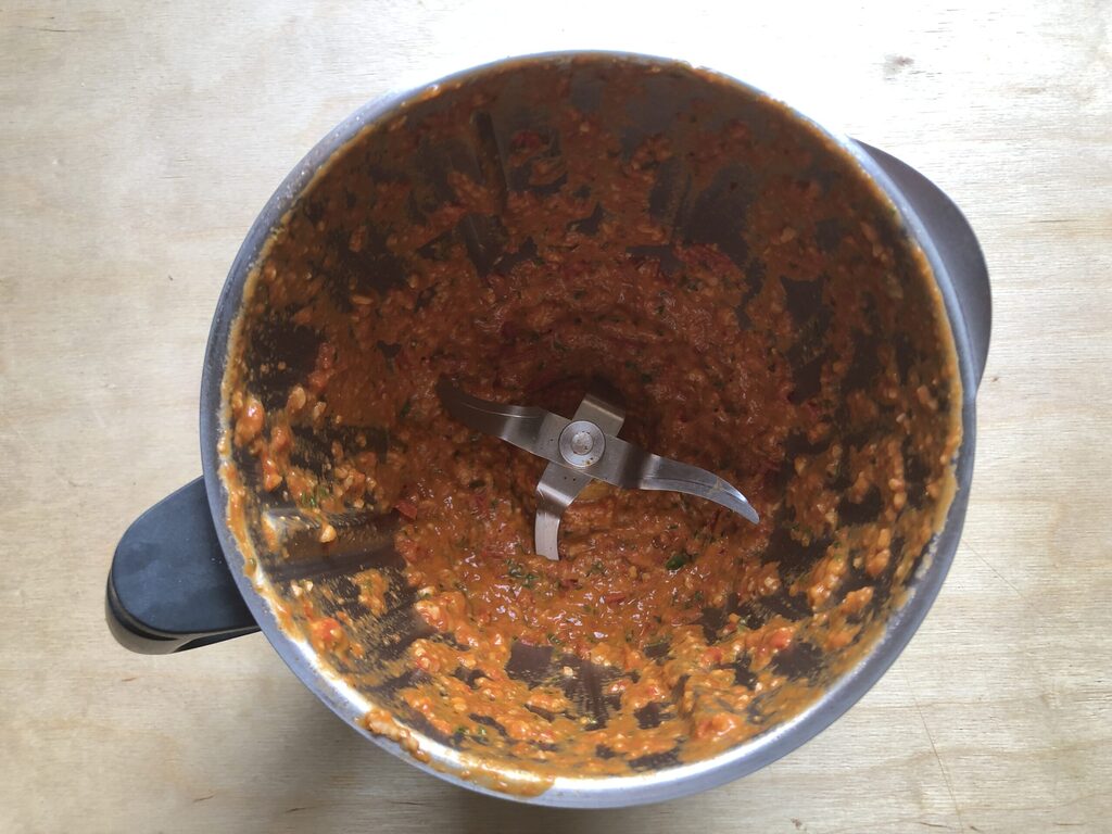 Mixer le tout à plusieurs reprises jusqu’à obtenir une crème homogène et rectifier le sel si nécessaire. Peu importe s’il reste quelques petits morceaux d’amande. En fait, ils seront très agréables à croquer.