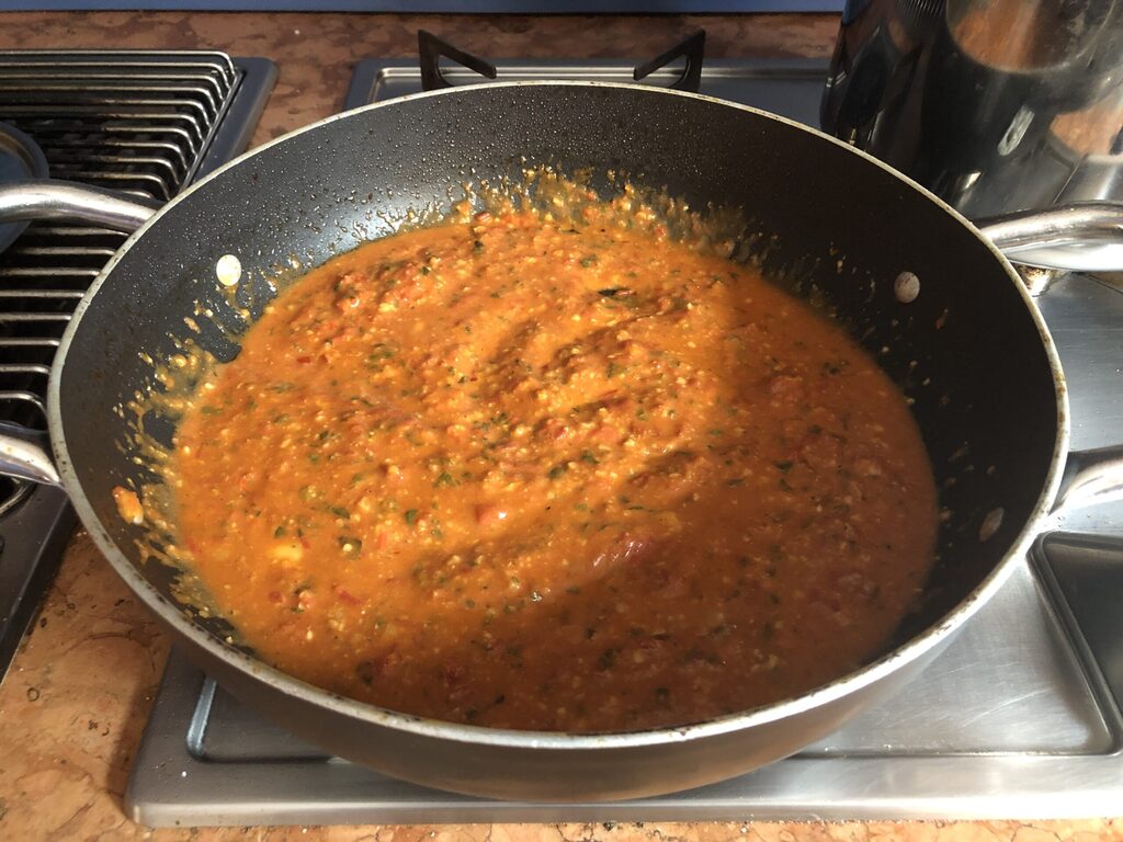 Verser cette crème à nouveau dans la poêle et la diluer avec quelques cuillères d’eau de cuisson des pâtes.