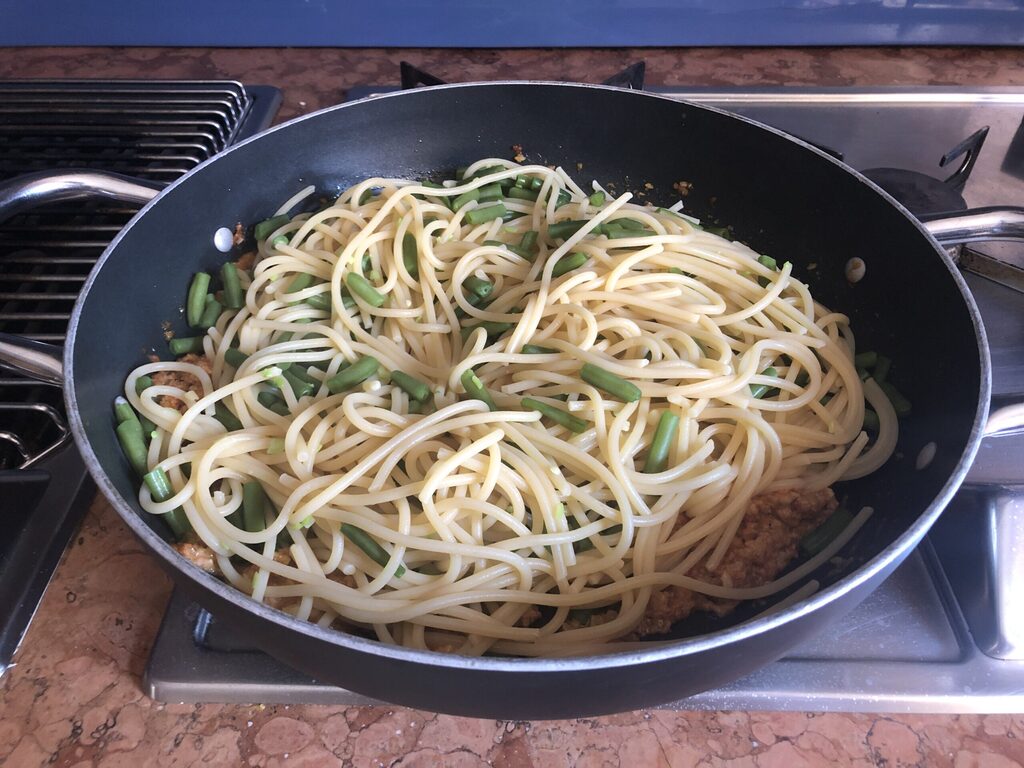 Terminer la cuisson, puis égoutter les spaghetti et les haricots verts et les transférer dans la poêle avec le condiment. Conservez un peu d’eau de cuisson à utiliser pour ramollir la sauce si elle s’avérait trop sèche.