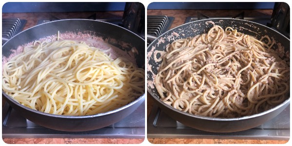 • Égoutter les spaghetti al dente et les transférer directement dans la poêle avec la sauce, en réservant une louche d’eau de cuisson.