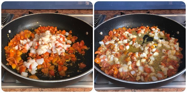 Dans une grande sauteuse, chauffer quelques cuillères d’huile et y faire revenir l’échalote. La laisser grésiller quelques instants, puis ajouter les tomates cerises.