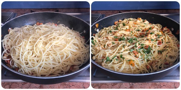 Pendant ce temps, faire cuire les spaghetti dans une grande quantité d’eau bouillante salée ; les égoutter al dente sans trop les égoutter et les transférer dans la sauteuse avec la sauce. Mélanger pour bien amalgamer tous les ingrédients et parfumer avec du persil haché.