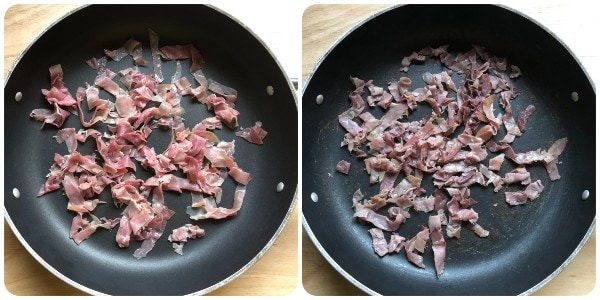 Chauffer légèrement une grande casserole, puis ajouter les lanières de jambon cru et les faire rissoler à feu doux pendant 3/4 minutes sans ajouter d’huile et en les mélangeant souvent. Ensuite, les retirer de la casserole et les mettre de côté.