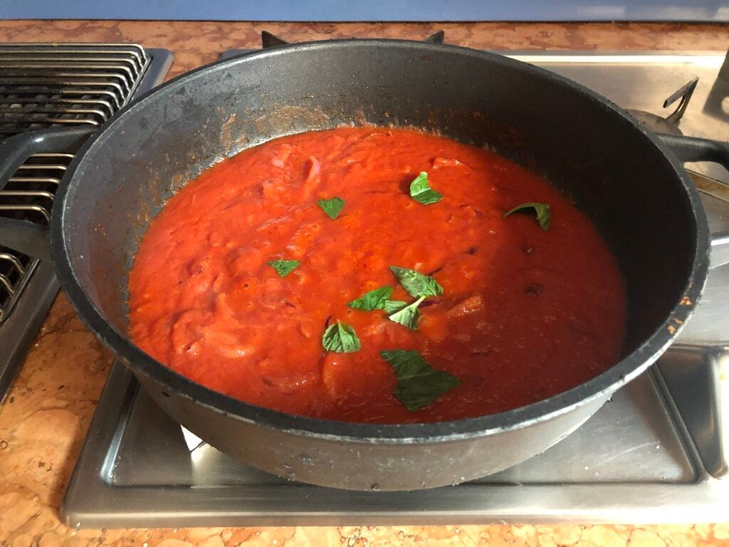 Laisser frémir quelques instants puis ajouter la purée de tomates, une généreuse pincée de sel, une pincée de bicarbonate (pour éliminer l’acidité de la tomate) et quelques feuilles de basilic déchirées à la main.
