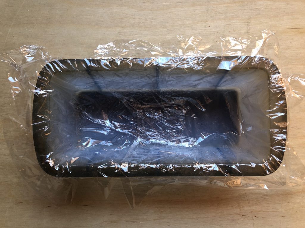 • Tapissez un moule à cake d’environ 25 x 11 cm avec du film alimentaire. Je vous conseille de laisser bien déborder le film afin qu’il soit plus facile de démouler le dessert après le refroidissement.