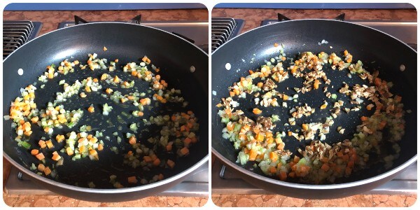 Dans une grande casserole, chauffer quelques cuillères à soupe d’huile avant d’ajouter le mélange pour soffritto.