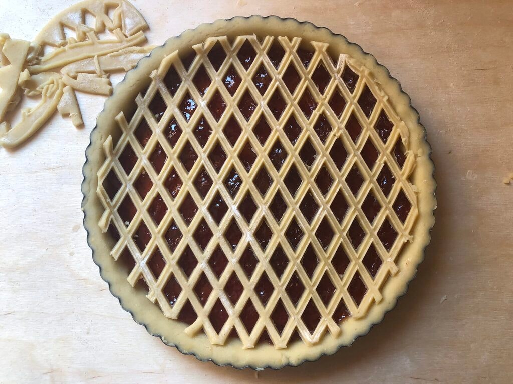 La tarte à la confiture que je vais vous décrire est réalisée avec une pâte sablée parfumée. Le tressage parfait qui la recouvre n’est pas, hélas, le résultat de je ne sais quelle dextérité manuelle de ma part. Si seulement j’étais aussi douée ! Je l’ai, au contraire, obtenu avec une grille à tartes ordinaire. Donc, elle est facilement reproductible par tous. Quant à la garniture, j’ai utilisé une confiture de fraises, mais vous pouvez la remplacer par toute autre confiture de votre choix. Pour être honnête, j’aurais préféré une marmelade d’oranges, mais comme mon fils ne l’aime pas du tout, cette fois-ci j’ai pensé à le satisfaire.