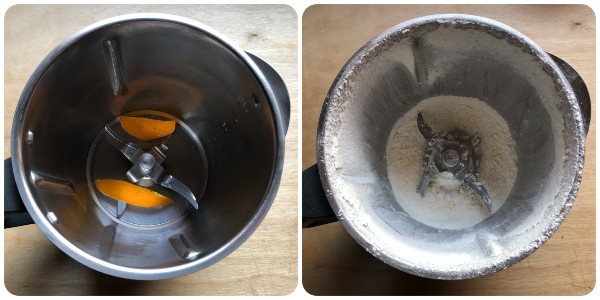 Mettre dans le bol le zeste d’orange, ajouter le sucre et mixer pendant 15 secondes à vitesse 7. Si vous n’avez pas le Bimby, je vous conseille de râper le zeste et d’utiliser du sucre glace.