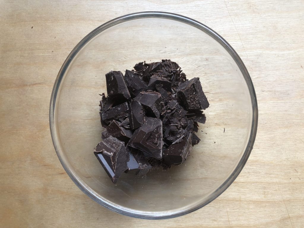 • Hacher grossièrement le chocolat noir et le faire fondre au bain-marie ou au micro-ondes. Mettre de côté.