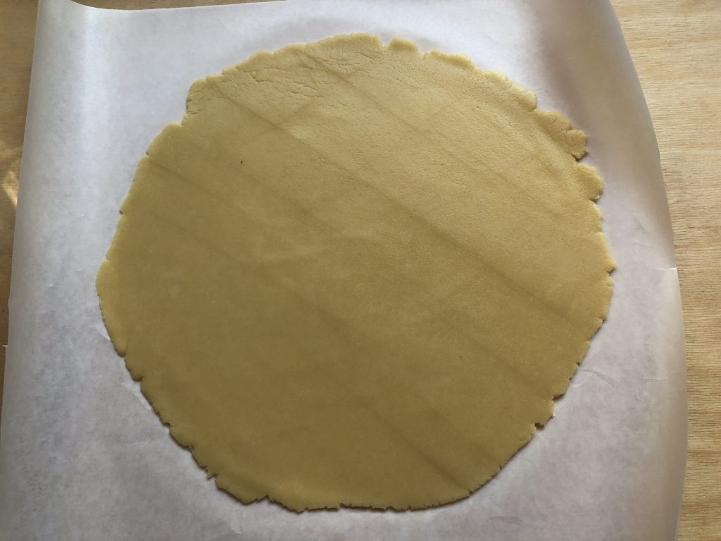 • La transférer sur le plan de travail, reprendre le pâton de pâte laissé au réfrigérateur et l’étaler au rouleau en formant un cercle du diamètre de la tarte.