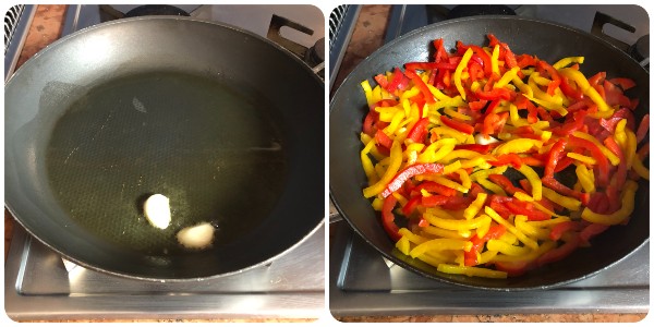 • Dans une poêle, chauffer quelques cuillères à soupe d’huile et y faire revenir la gousse d’ail pelée et coupée en deux. Laisser frétiller quelques instants, puis ajouter les poivrons.