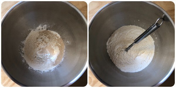 Tamiser la farine dans le bol du robot pâtissier, ajouter la levure sèche, le sucre et mélanger avec un petit fouet à main.
