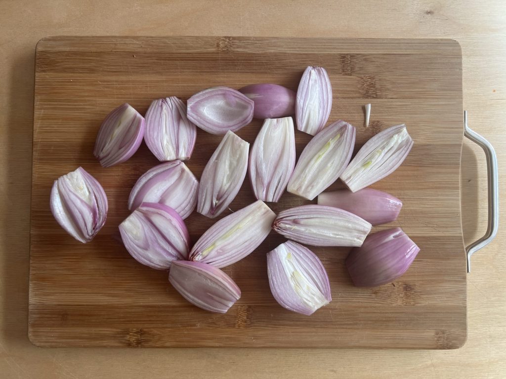 Éplucher les échalotes et couper les plus grosses en tranches dans le sens de la longueur tandis que les plus petites en deux.