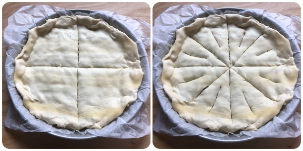 Avec un couteau bien aiguisé, inciser la surface comme montré sur les photos : vous devez obtenir huit parts. Faire une petite incision à l’intérieur de chaque part.