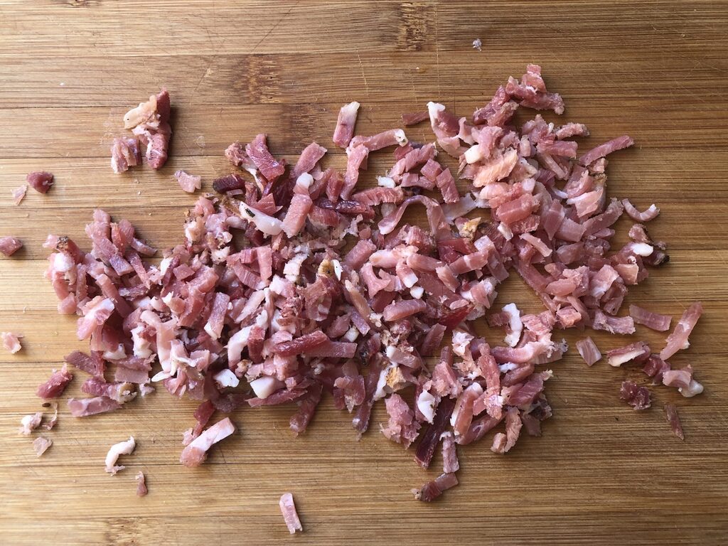 Puis ajouter les morceaux de speck et continuer la cuisson pendant 5/6 minutes supplémentaires. Une fois la cuisson terminée, transférer le tout dans une assiette et laisser refroidir.