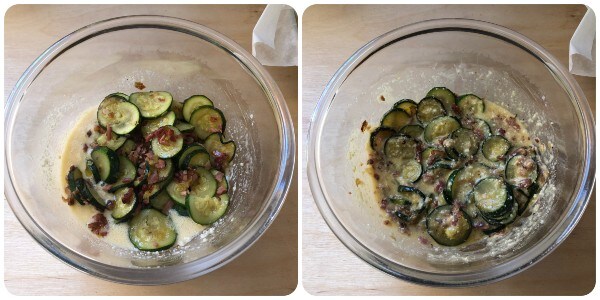 Équeuter les courgettes, les laver et les couper en rondelles avec un couteau. N’utilisez pas la mandoline car vous obtiendriez des tranches trop fines.