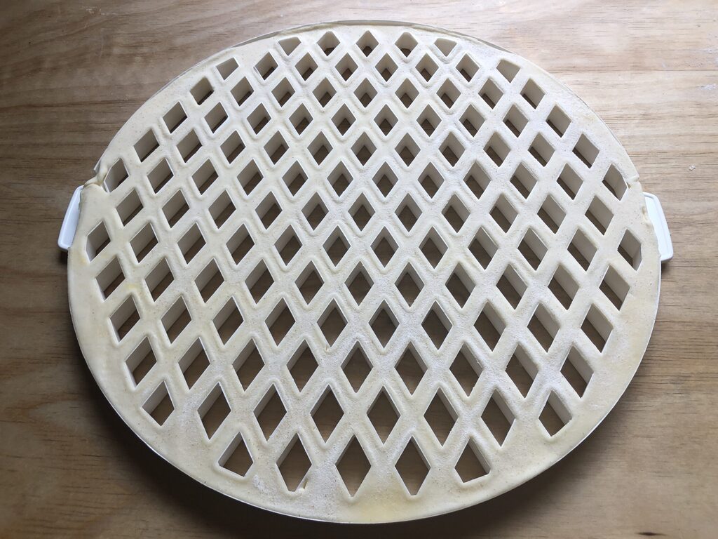 Poser un disque de pâte sur la grille pour tartes. Pour en savoir plus sur cet objet et son fonctionnement, je vous renvoie à un article que j’ai écrit il y a quelque temps. Vous pouvez le lire en cliquant ICI. Vous trouverez cette grille dans les magasins d’articles pour la maison ou en ligne en cliquant ICI.