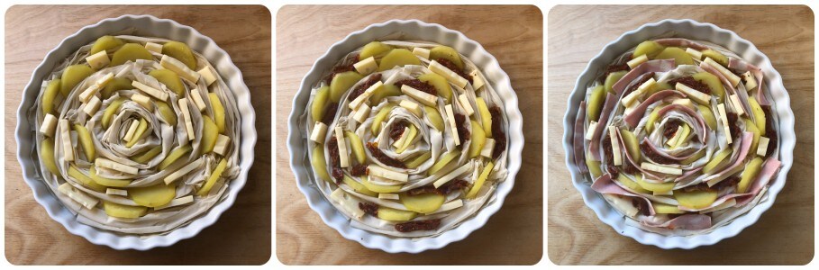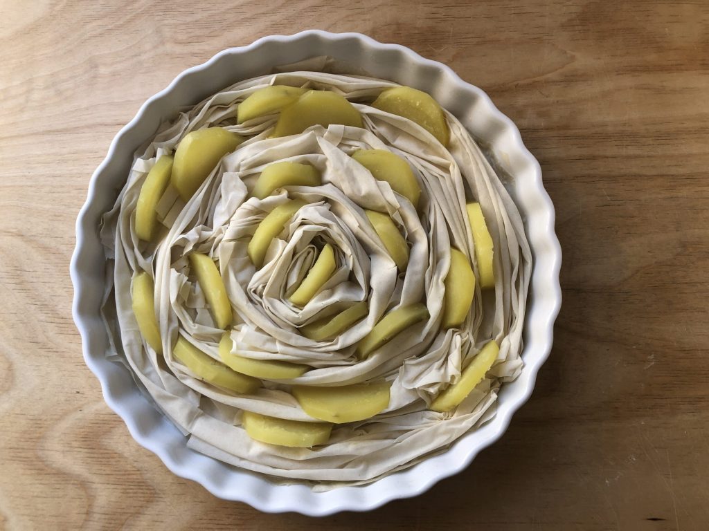 • Couper les pommes de terre cuites en tranches et les insérer ici et là entre les plis de la pâte.