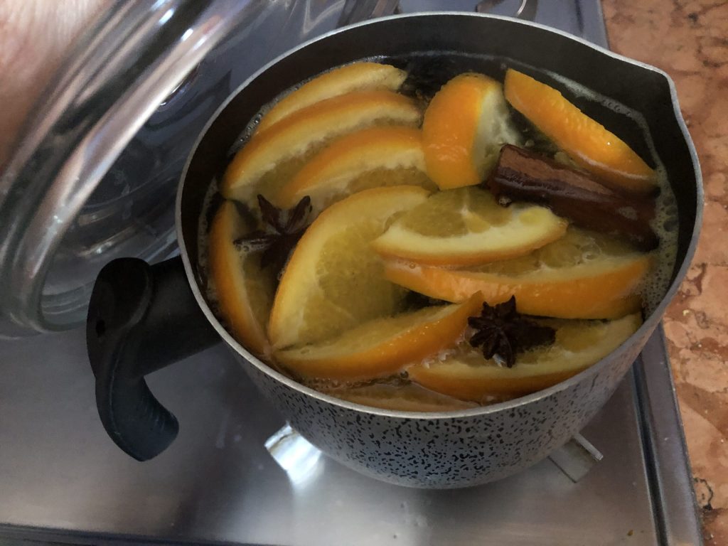 Cela vaut la peine d’essayer cette tisane à l’orange ne serait-ce que pour le délicieux arôme qui se répand dans la cuisine pendant qu’elle bout sur le feu. C’est enivrant, enveloppant, relaxant. Au goût, ensuite, elle est délicieuse. Journée grise, cheminée, couverture, livre dans une main et tasse dans l’autre : mmmmm… un vrai câlin.