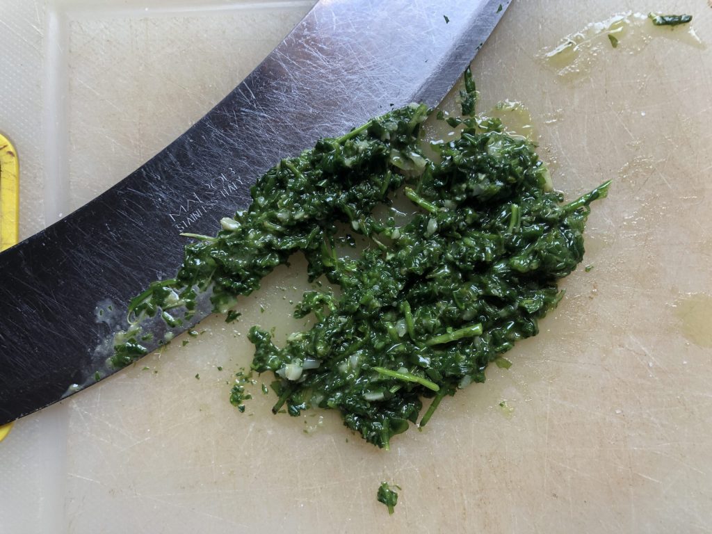 • À la fin de la cuisson, transférer le tout sur une planche à découper et hacher finement avec un couteau à bascule. J’ai essayé de hacher dans le bol mais la quantité de roquette est trop petite et les lames tournaient à vide. J’ai donc préféré procéder manuellement. Mettre de côté.
