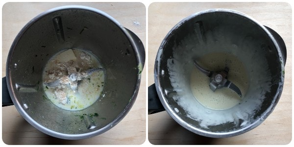 • Sans laver le bol, mettre le reste du beurre (10 g), la farine, le lait, une généreuse pincée de sel, et une bonne quantité de noix de muscade et préparer une béchamel en cuisant pendant 6 minutes, 90°C vit. 4.