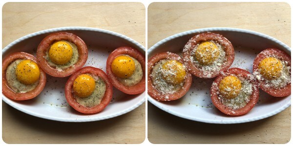 • Puis casser un œuf sur chaque tomate en éliminant une partie du blanc s’il est trop abondant. Vous devez essayer de garder le jaune intact.