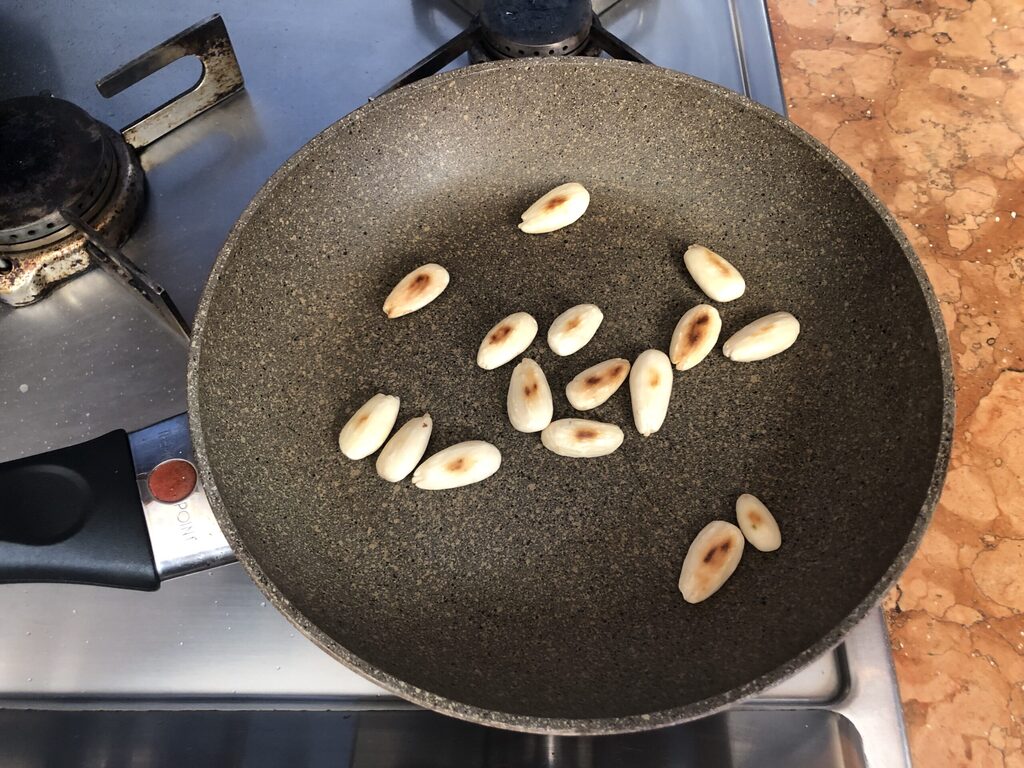 • Bien chauffer une petite poêle et y griller les amandes à feu moyen sans aucun assaisonnement en les mélangeant jusqu’à ce qu’elles deviennent légèrement dorées. De cette façon, elles libéreront un parfum plus intense. Les retirer de la poêle et les mettre de côté.