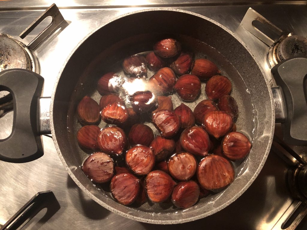 Le temps de cuisson que j’ai indiqué ci-dessus ne comprend pas celui pour cuire les châtaignes. Dans les ingrédients, je parle en effet de châtaignes déjà cuites et pelées. Plus bas, cependant, je vous explique comment faire.