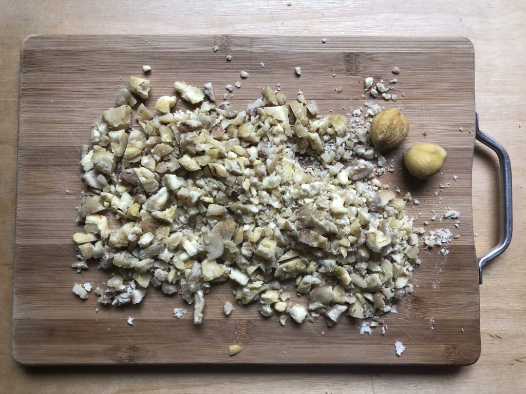 Dans cette recette, il faut des châtaignes déjà cuites et pelées. J’ai fait cette opération la veille au soir. Je les ai rincées rapidement sous l’eau courante, puis je les ai mises dans une casserole et les ai couvertes d’eau froide. Ensuite, j’ai mis le couvercle et les ai cuites pendant 40 minutes. Le temps de cuisson dépend naturellement de la taille de vos châtaignes. Elles seront prêtes lorsque vous pourrez les piquer avec les dents d’une fourchette. Attention, cependant, elles ne doivent pas être trop molles. Après les premiers 40 minutes, vérifiez-les souvent.