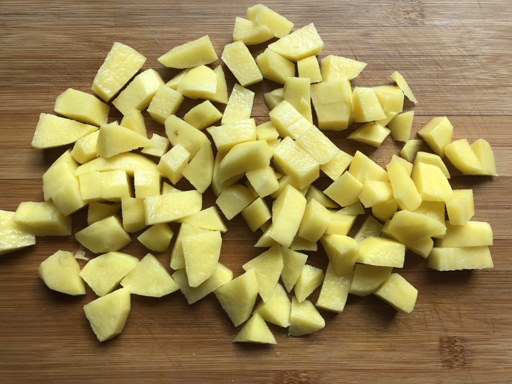Éplucher les pommes de terre, les laver et les couper en morceaux.