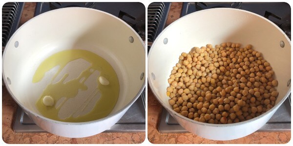 Dans une cocotte spacieuse, chauffer quelques cuillères à soupe d’huile et y faire revenir la gousse d’ail épluchée et coupée en deux. La laisser frémir un instant, puis la retirer et ajouter les pois chiches.