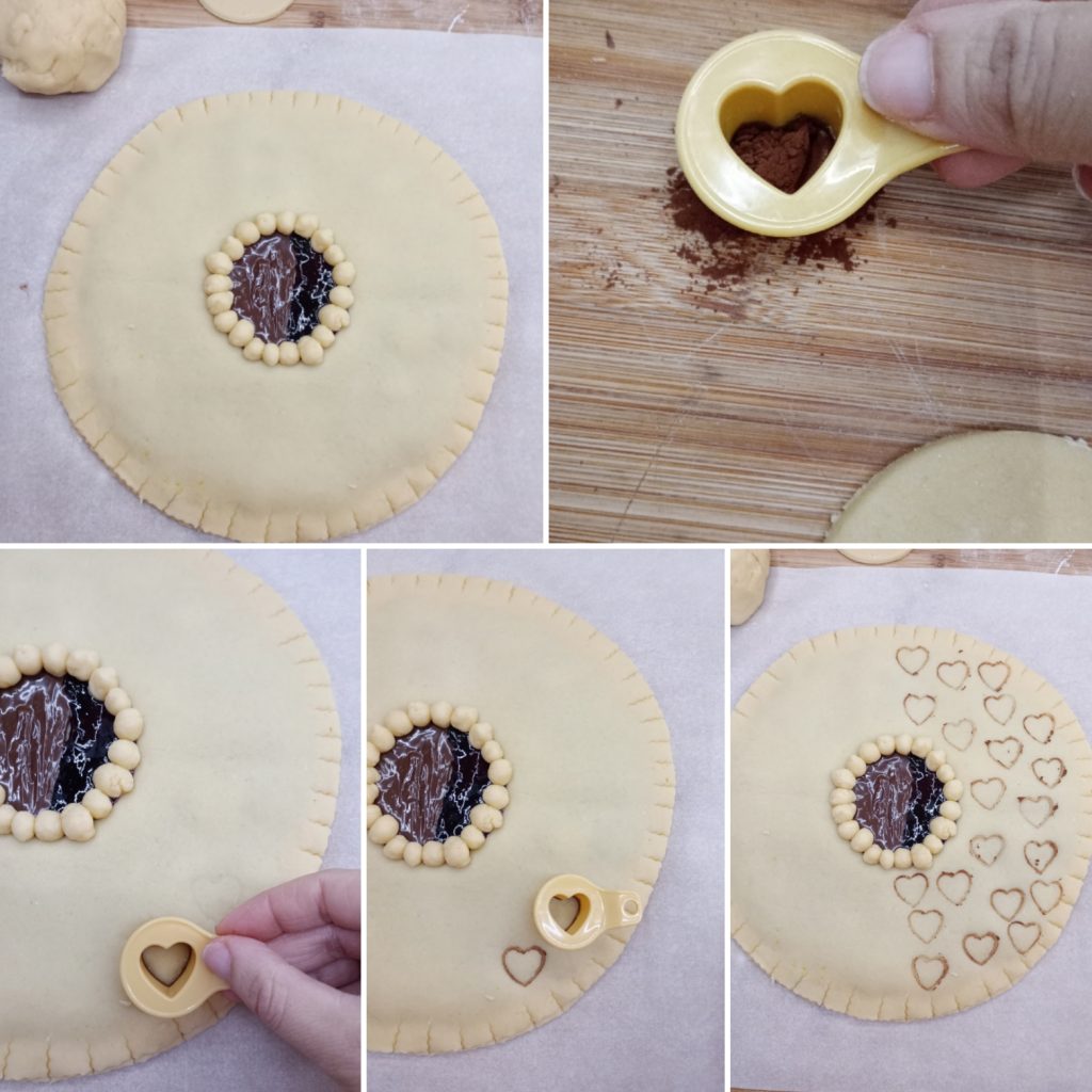 le biscuit géant est prêt à être enfourné. J’ai voulu le décorer davantage en utilisant un emporte-pièce que j’ai préalablement posé sur du cacao et j’ai ensuite exercé une légère pression sur le biscuit géant.