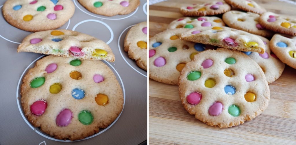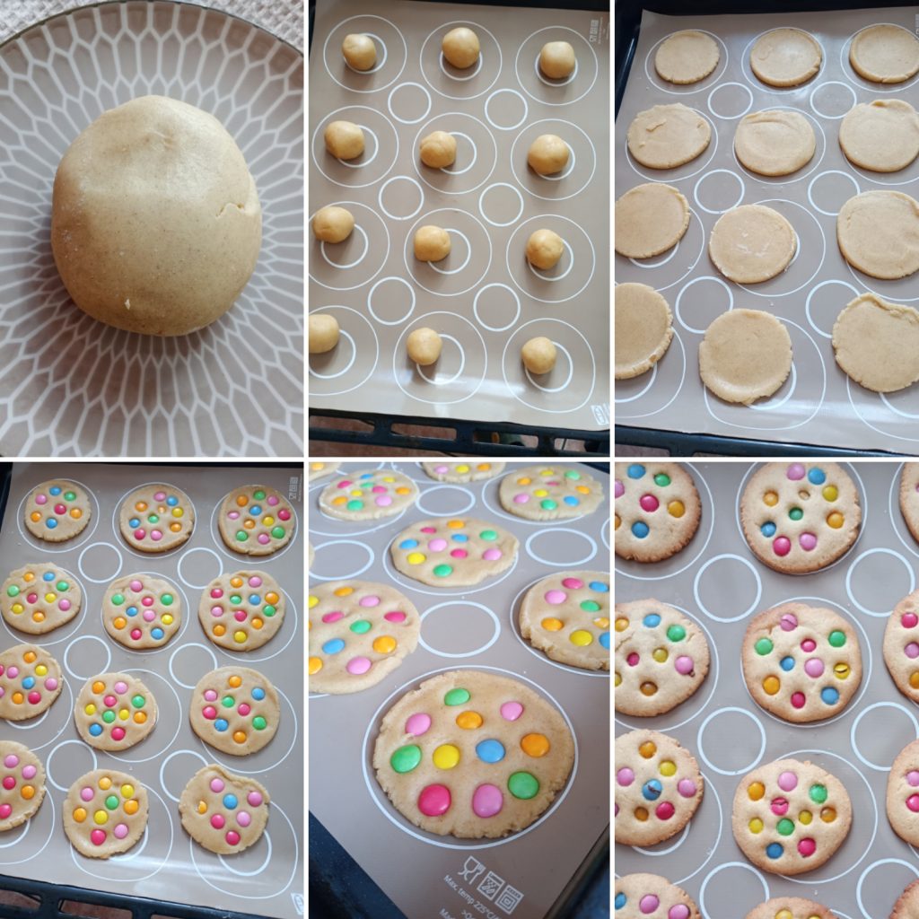 Prendre de petits morceaux de pâte et former des boules, les déposer sur une plaque recouverte de papier sulfurisé et avec le fond d’un verre fariné, ou avec les mains, aplatir chaque boule.Disposer les petits bonbons en chocolat dessus et appuyer dans la pâte.