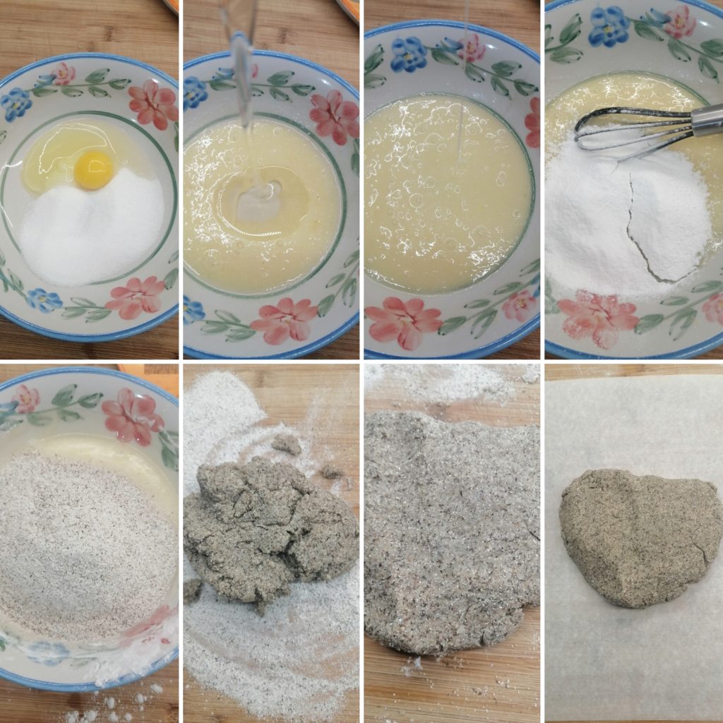 Commencer à verser à l’intérieur, petit à petit, la farine de riz tamisée et la farine de sarrasin en plusieurs fois, puis l’eau. Travailler avec une fourchette jusqu’à ce que ce soit possible, puis avec les mains.