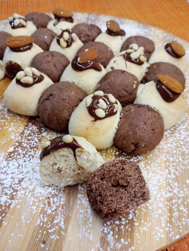 J’ai alterné des boules de pâte claire avec celles sombres au cacao pour créer un effet « damier » super mignon et gourmand. Pour la finition, une touche de chocolat fondu et une amande ou des pignons les rendent élégants et prêts pour chaque occasion.