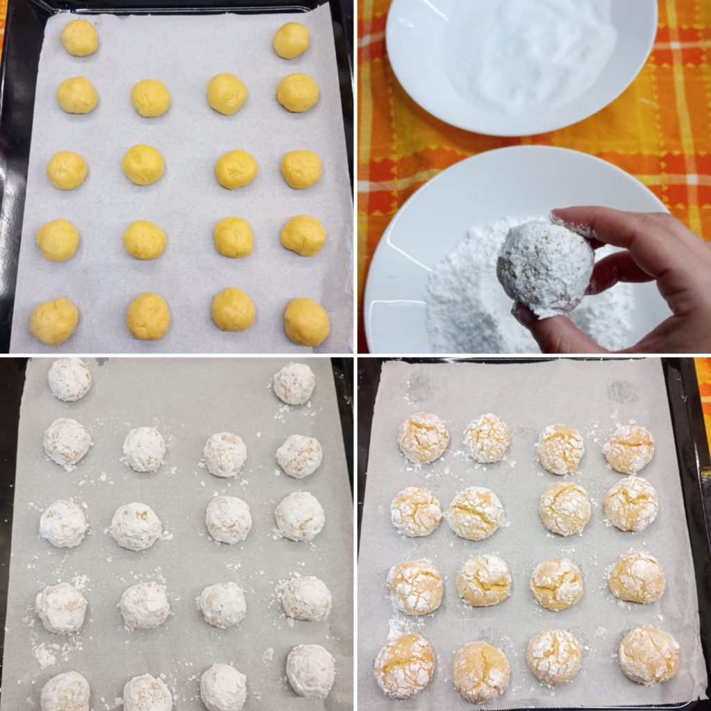 Seulement après les avoir toutes créées, passe-les rapidement dans le sucre glace. Dispose-les sur une plaque recouverte de papier cuisson.