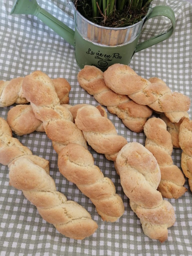 Biscuits en forme de tresse Siciliens. Je partage avec vous une recette de ma terre. Les biscuits en forme de tresse Siciliens. On les trouve dans les boulangeries et leur parfum est inconfondible. Parfum d’authenticité. Cette recette se rapproche beaucoup du biscuit traditionnel. Chaque fois que je les prépare, mon esprit est entouré de beaux souvenirs. Idéaux pour le petit-déjeuner, une fragrance spéciale, qui séduit. Grâce à l’ammoniaque pour pâtisserie, qui remplace la levure chimique, ils se conservent également pendant une semaine dans un récipient en verre ou autre.