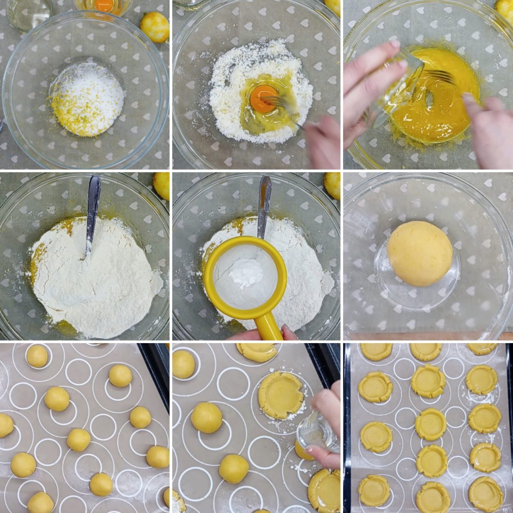 Pétrir bien tous les ingrédients jusqu’à former un pâte compacte et souple.Prélever de petits morceaux de pâte et former des boules, les déposer sur une plaque recouverte de papier sulfurisé et avec le fond d’un petit verre appuyer au centre de chaque boule pour créer un creux.