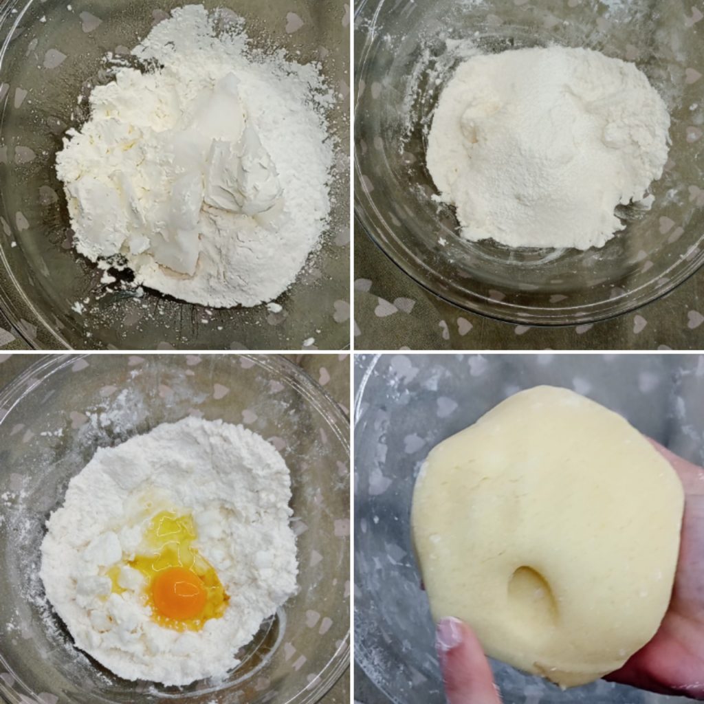 • Commencez par travailler la farine de riz et la fécule de pommes de terre avec le saindoux. Frottez le mélange entre vos mains jusqu’à obtenir une consistance sableuse. Incorporez ensuite le sucre semoule, l’œuf, le lait et la levure chimique. Pétrissez rapidement jusqu’à obtenir une pâte homogène, enveloppez-la dans du film alimentaire et laissez reposer au réfrigérateur pendant une heure.