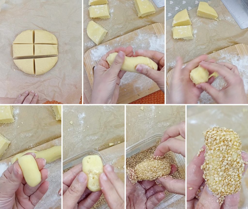 Prélevez de petits morceaux de pâte d’environ 20-25 g chacun. Formez d’abord des boules, puis modelez chaque morceau pour lui donner la forme rectangulaire allongée classique des reginelle. Humidifiez vos mains et mouillez toute la surface des biscuits, puis roulez-les dans les graines de sésame, en pressant bien pour les faire adhérer.