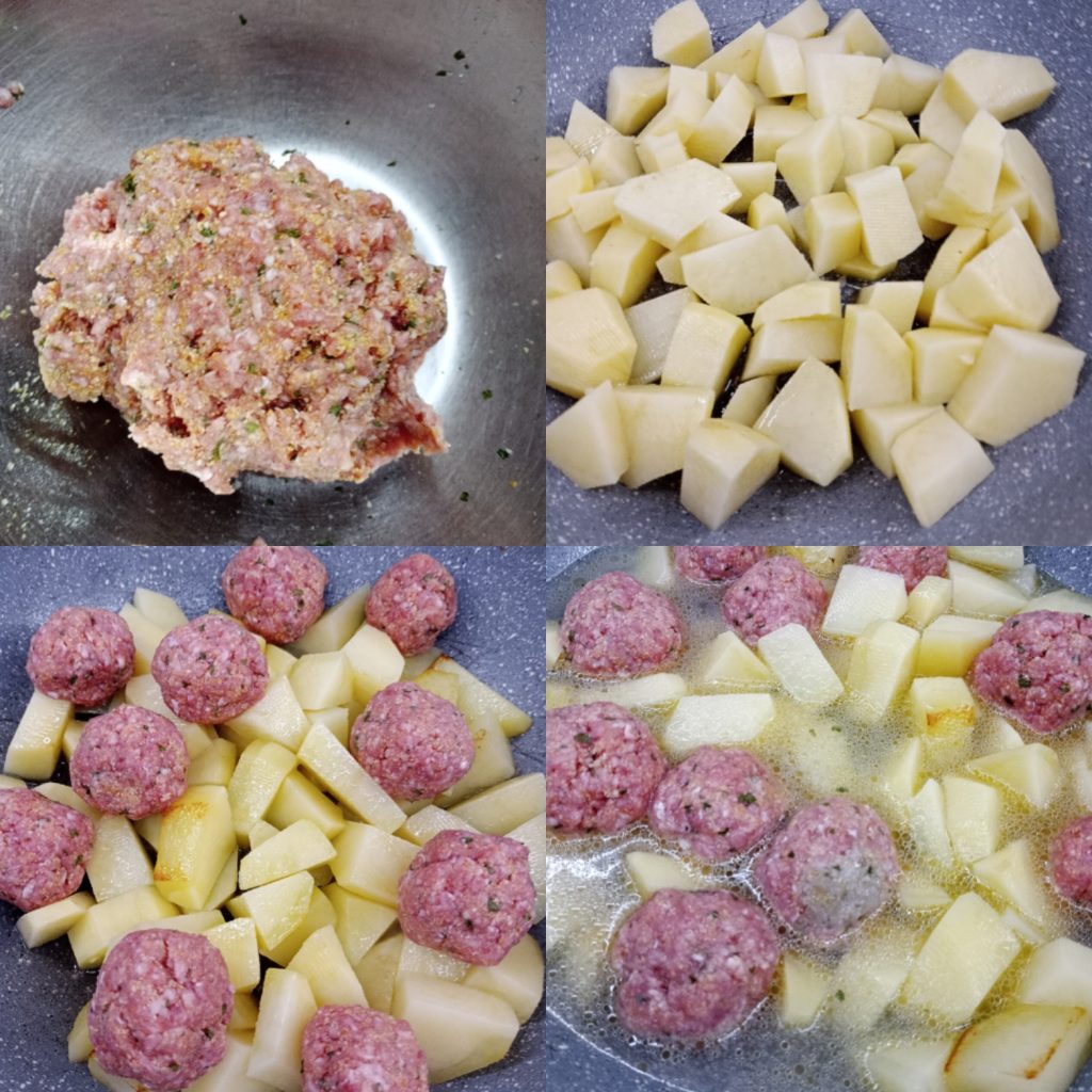 Pendant ce temps, préparer les boulettes et les insérer progressivement dans la poêle, ajouter les deux verres d’eau tiède et saler.