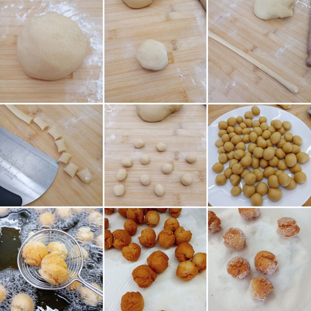 Prélever des boules de pâte et former des boudins de 1 cm d’épaisseur, puis les couper en petits morceaux. Prendre chaque morceau et avec les mains former des boules, essayer de les réaliser toutes de dimensions similaires pour qu’elles cuisent uniformément.