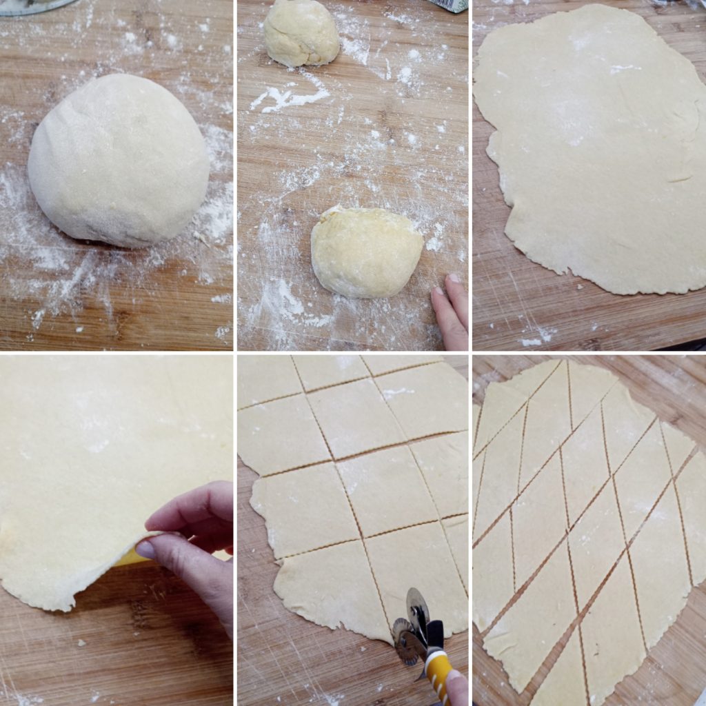 Étendre la pâte très finement sur une surface farinée, pour plus de commodité, j’ai divisé la pâte en deux. Avec une petite roulette ou un couteau, créer des bandelettes ou des rectangles (comme vous préférez). Préparer tous les morceaux.