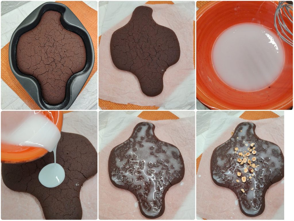 Une fois le gâteau froid, préparez le glaçage avec 100 g de sucre glace en ajoutant l’eau goutte à goutte, petit à petit, car il devient liquide très facilement.J’ai choisi de le laisser semi-liquide pour que le gâteau en absorbe un peu et reste plus gourmand. Étalez le glaçage sur la surface et saupoudrez immédiatement avec les noisettes grossièrement hachées (je les ai écrasées en les mettant dans un sac et en les frappant avec le rouleau), afin qu’elles restent bien collées.